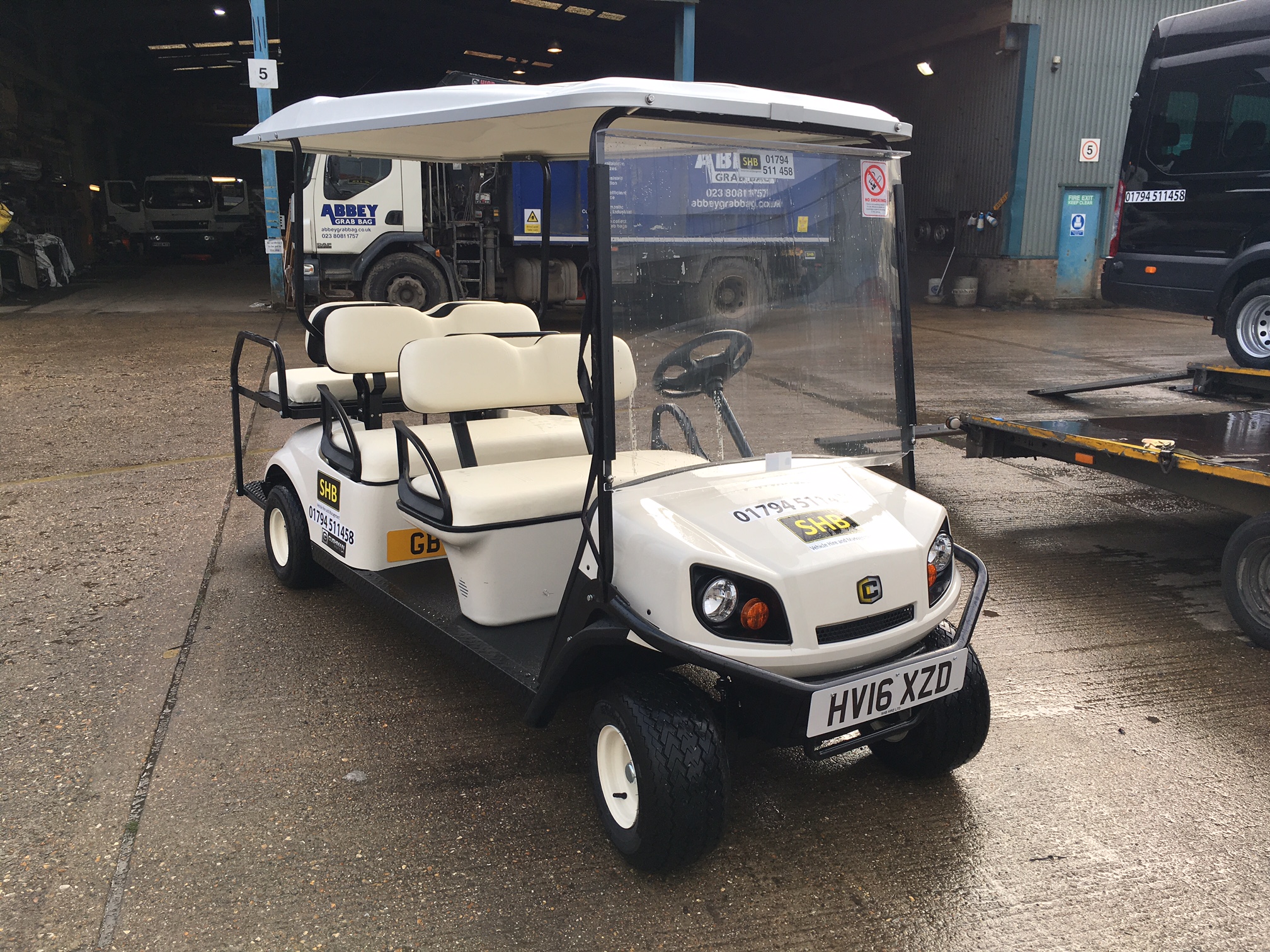 Six seat buggy with four forward facing seats and two rear facing seats. The roof will cover all passengers and also includes front windshield, lights and horn.