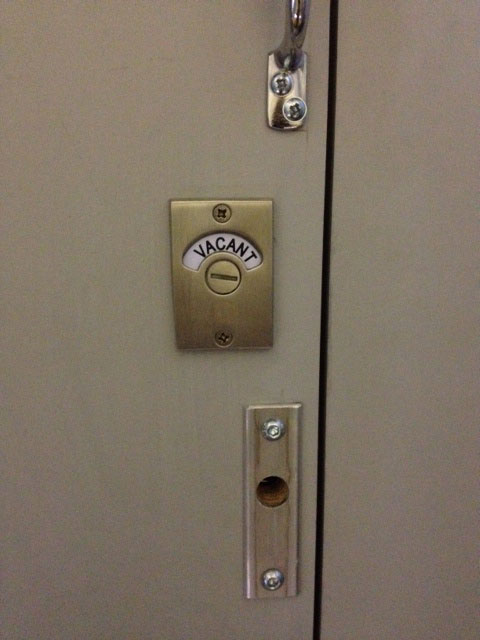 Separate sink and pump for hand washing in the cubical. Coat hooks and mirror.