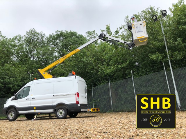 SHB’s brand new fleet of 3.5T Ford Transits are fitted with a working height of 13.0m: a maximum bucket capacity of 230kg, a 120o Flyboom rotation and a maximum outreach of 8.5m!